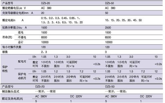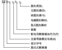 DZ5系列塑料外壳式断路器适用于交流50Hz、380V、额定电流自0.15至50A的电路中。保护电动机用断路器用来保护电动机的过载和短路,配电用断路器在配电网络中用来 分配电能和作线路及电源设备的过载和短路保护之用,亦可分别作为电动机不频繁起动及线路的不频繁转换之用。 二,型号及意义